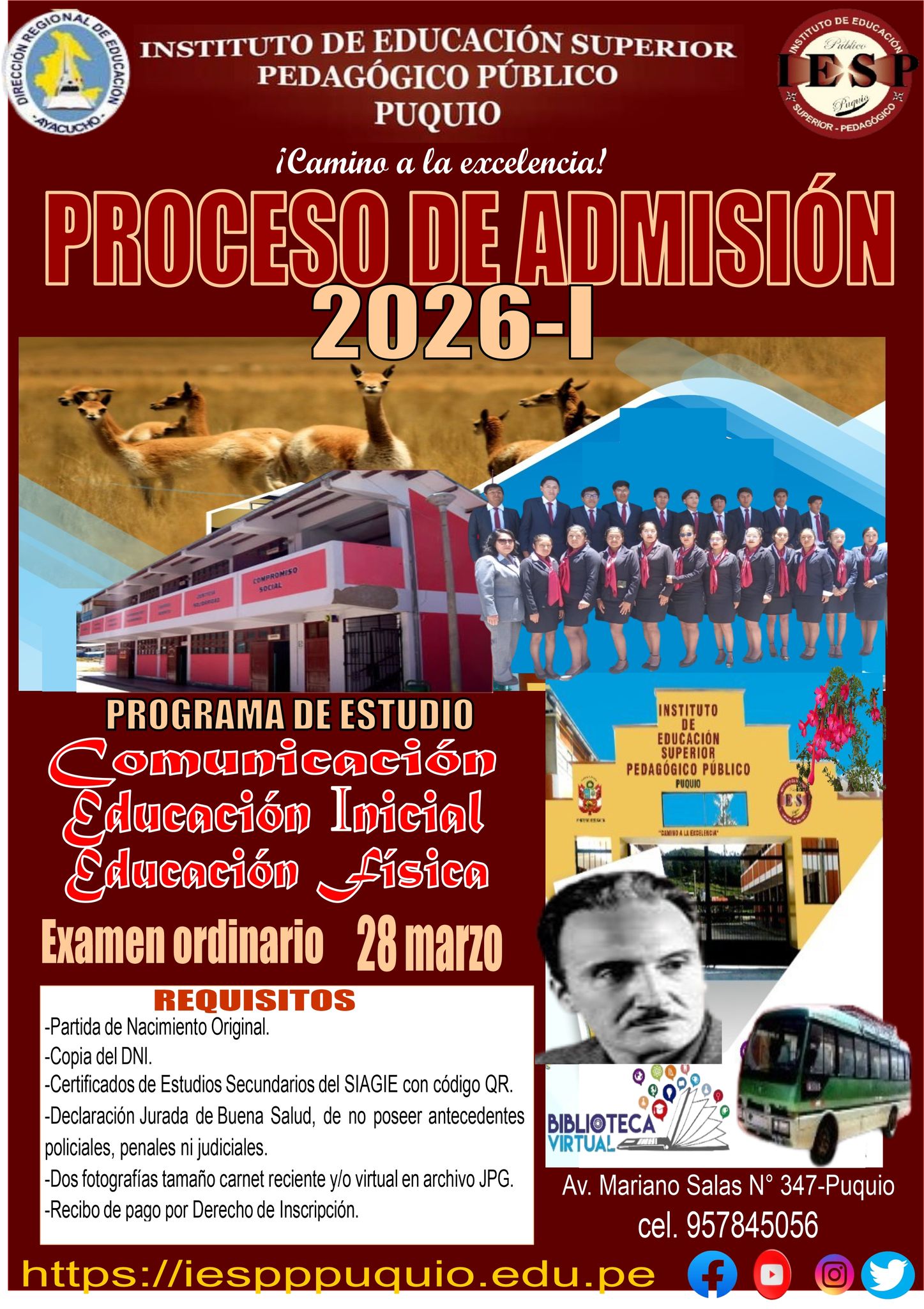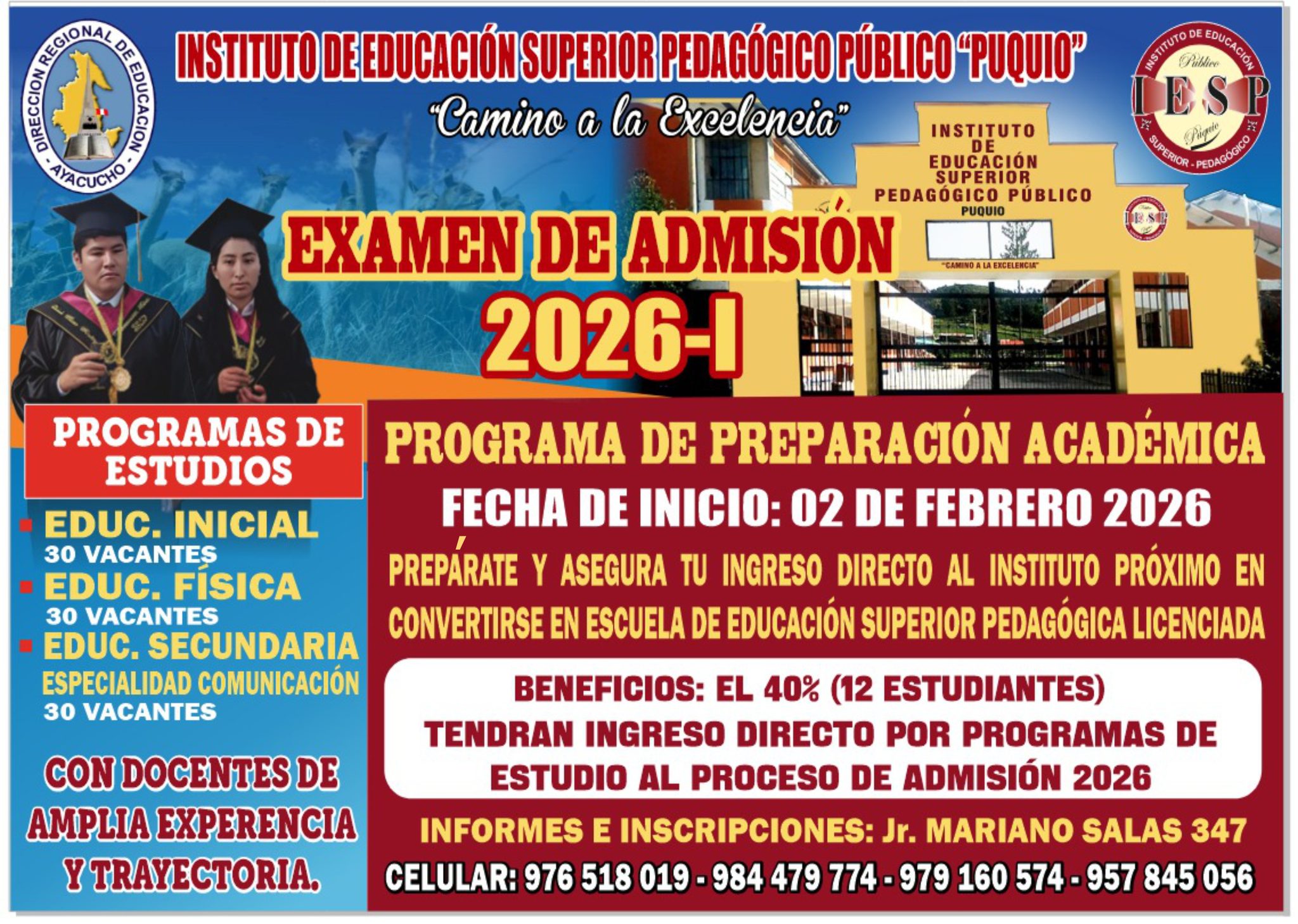 El Instituto de Educación Superior Pedagógico Público “Puquio” autorizado por RVM N° 157-2020- MINEDU, convoca a Examen de Admisión en la modalidad no presencial (virtual), en las carreras profesionales.